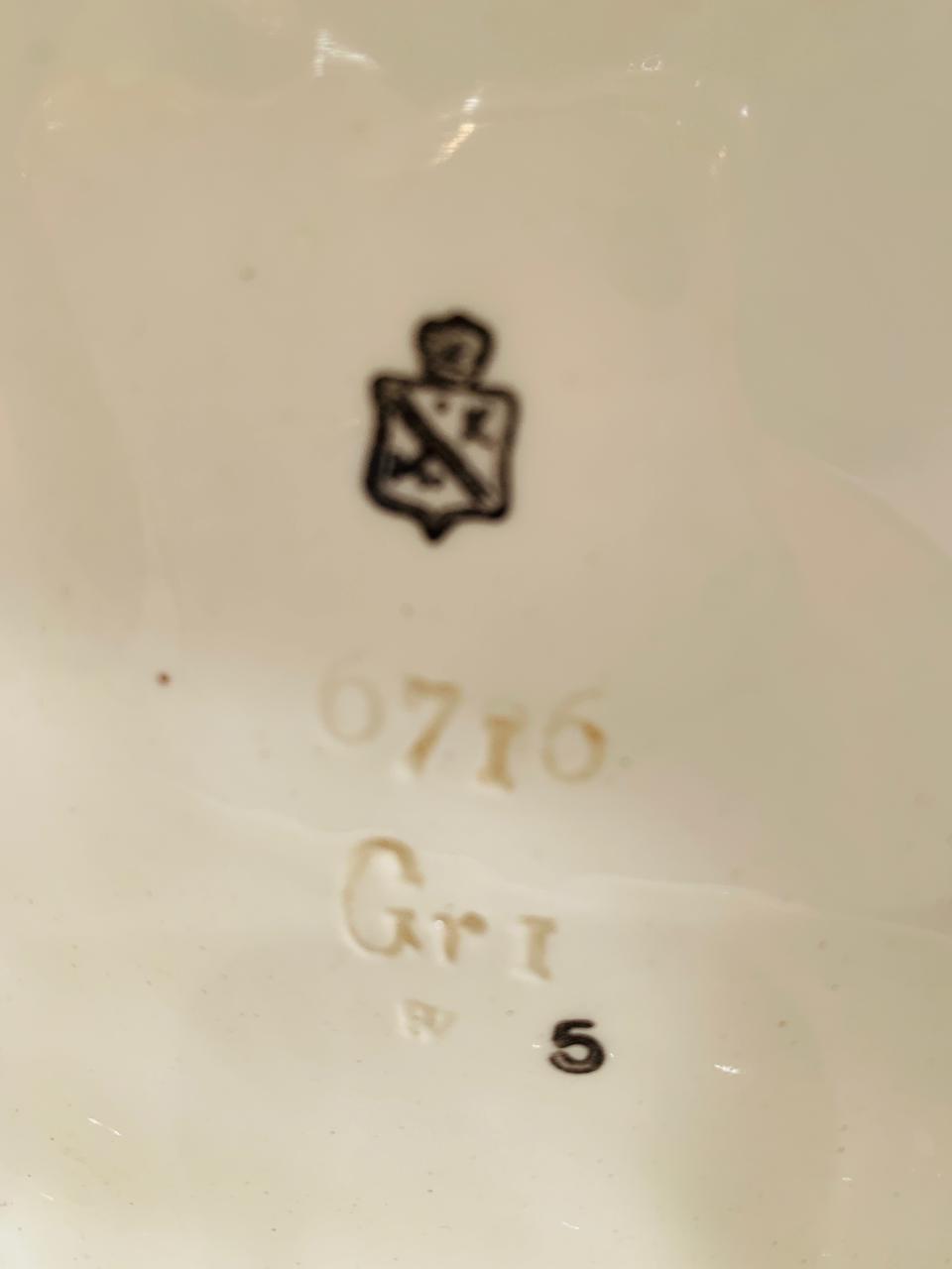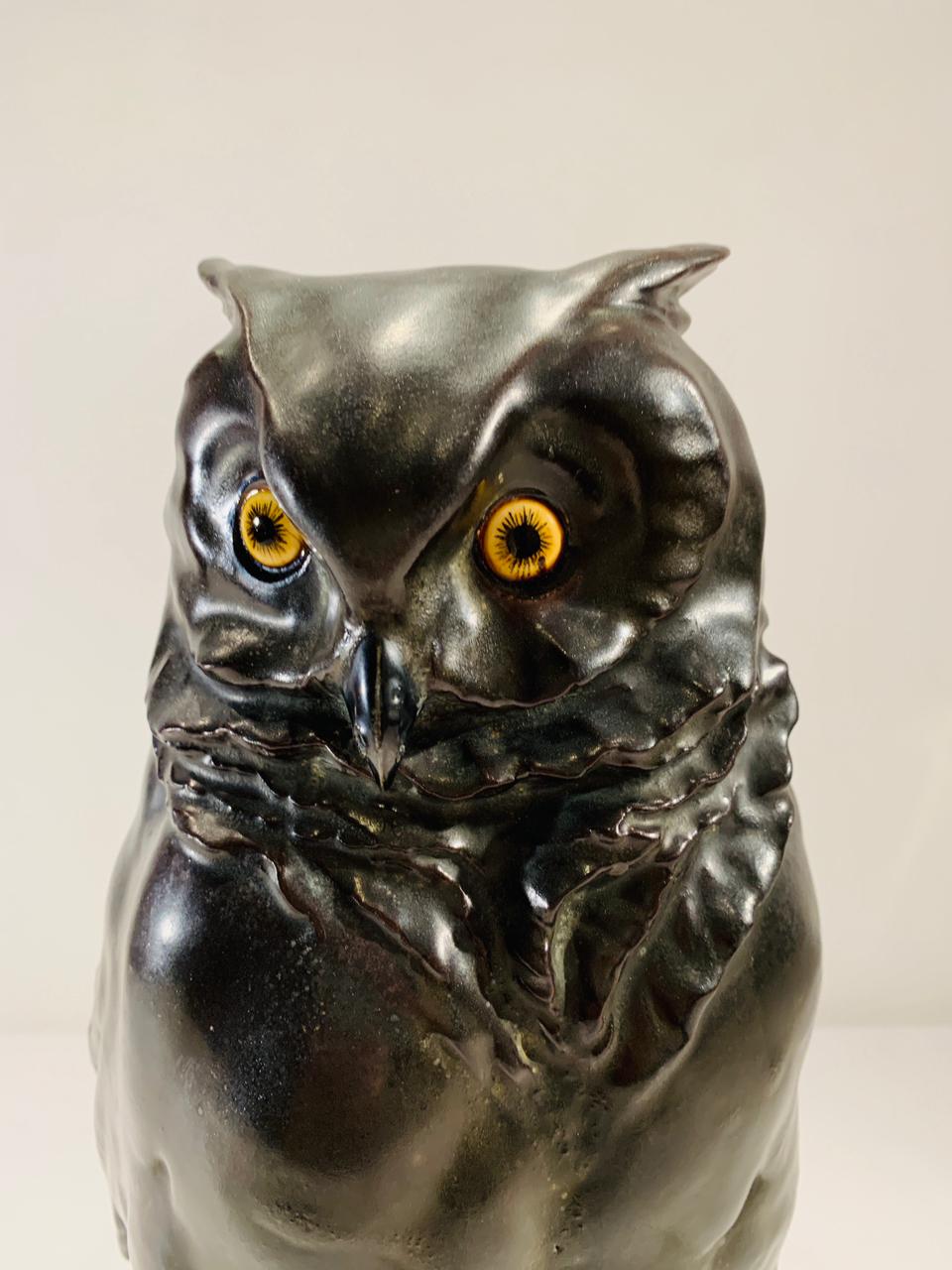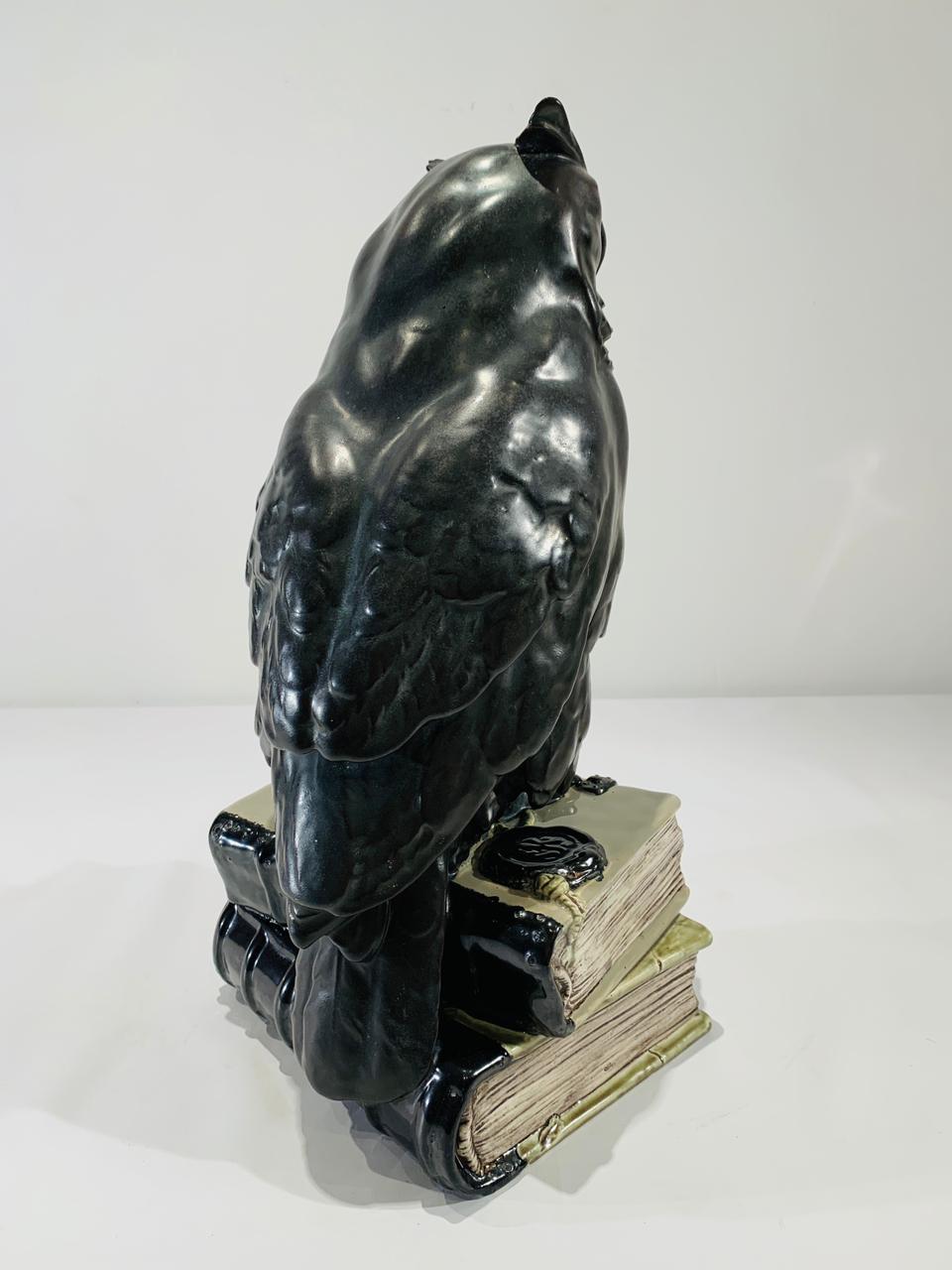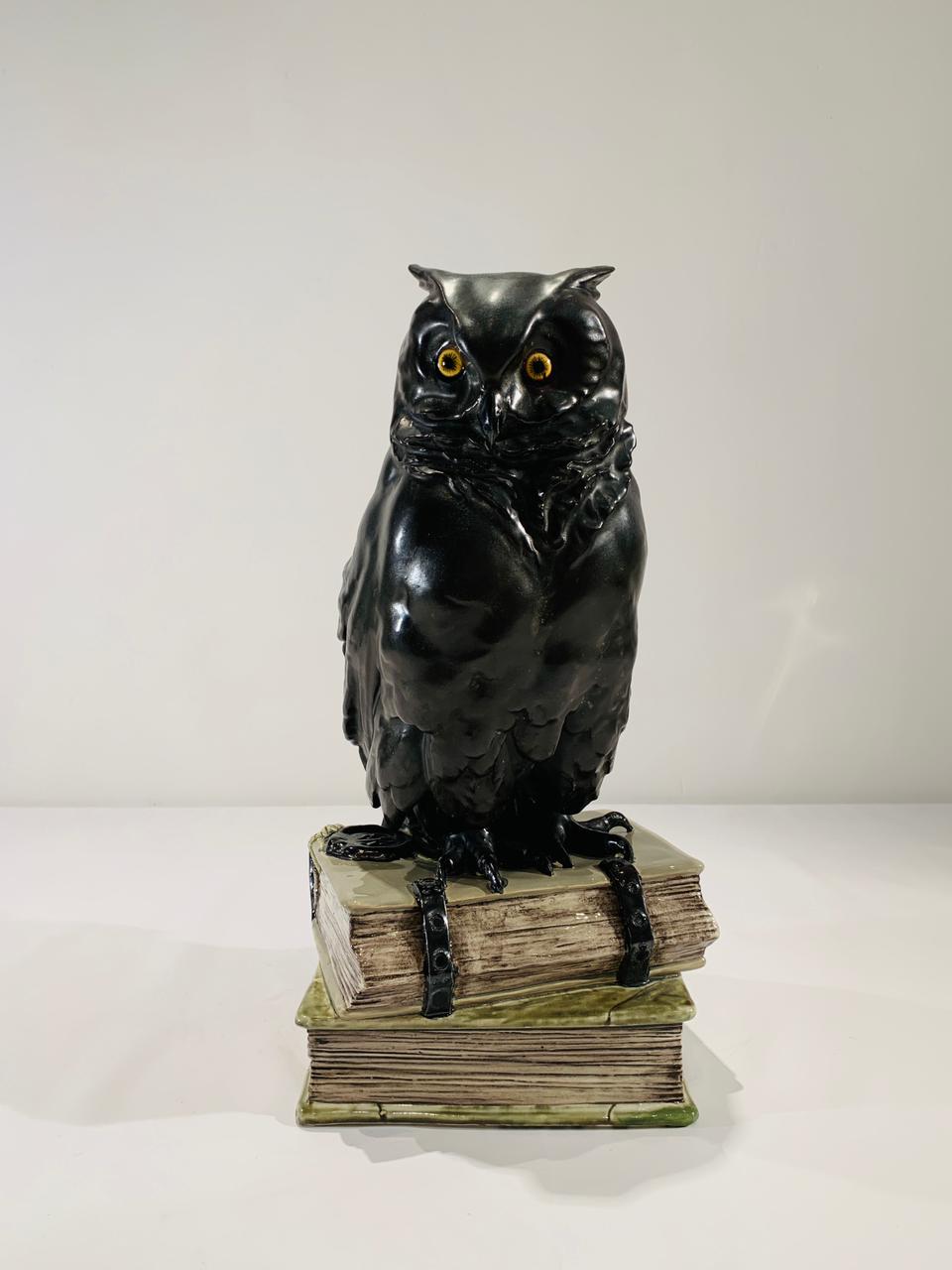 Coruja em porcelana policromada sobre livros assinada GRI Alemanha.