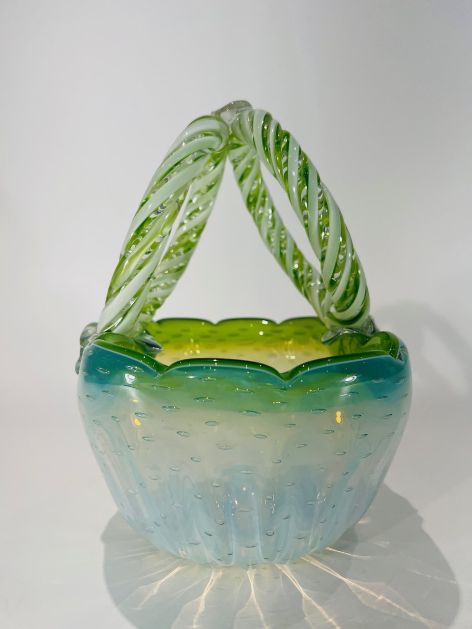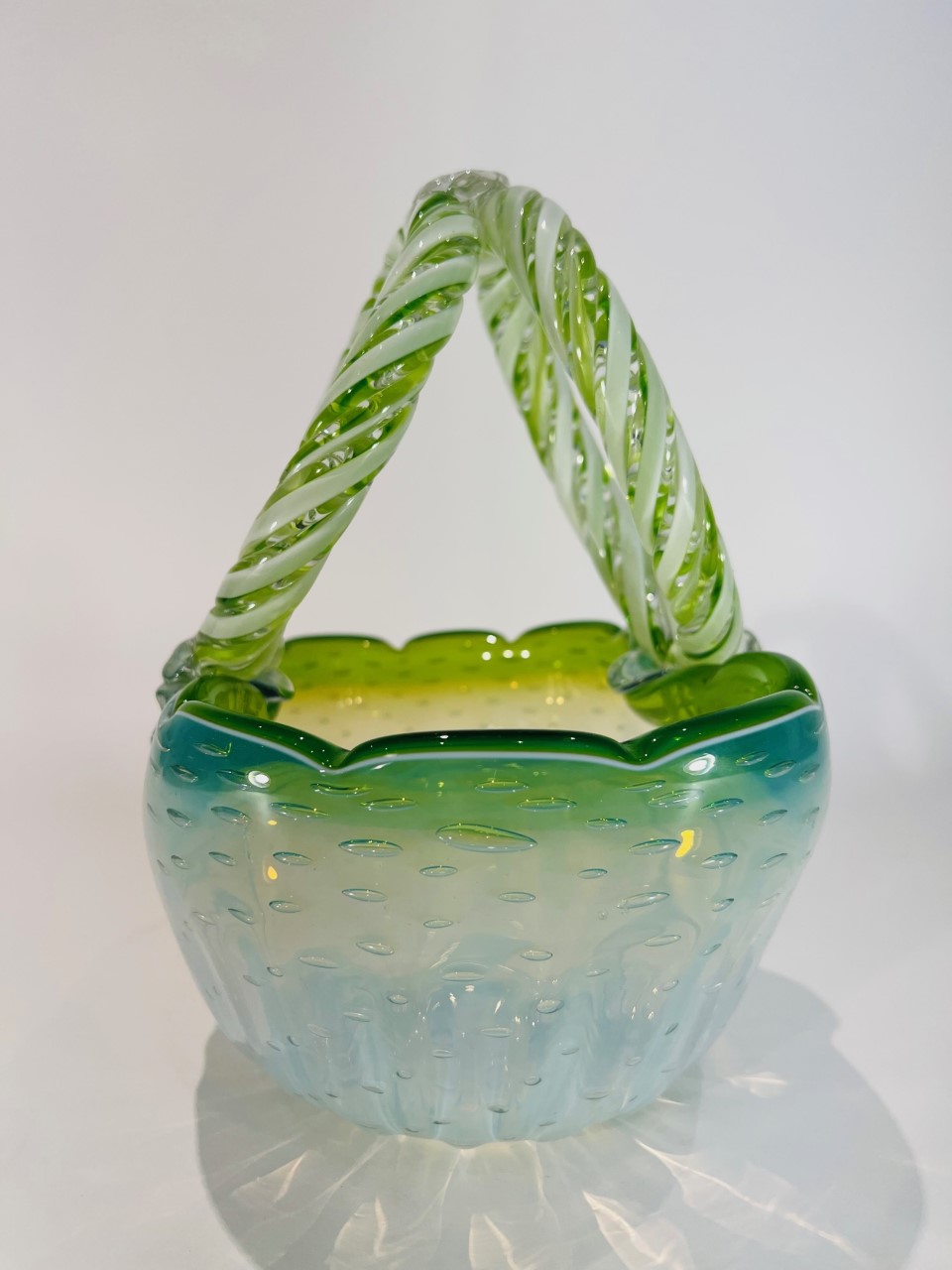 Cesta em vidro artístico soprado de Murano atribuído a CENEDESE com vidro aplicado e “bulicante”