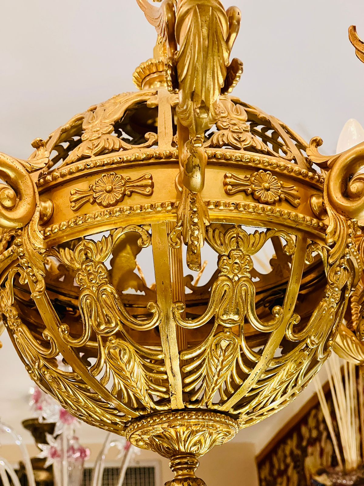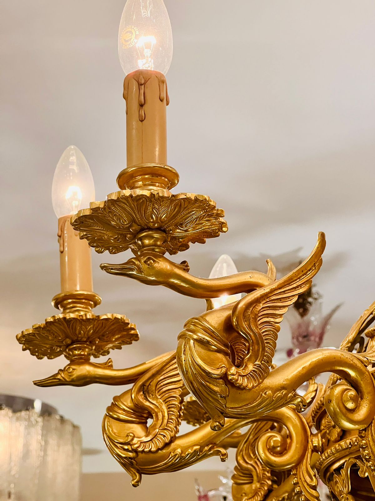 Lustre francês em bronze banhado a ouro estilo Império com Quimeras de cisnes alados para 8 lâmpadas circa 1790